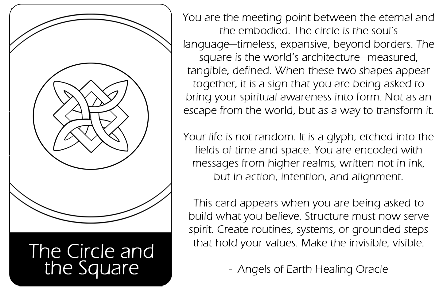 The circle has long represented spirit, eternity, and the boundless. The square is its earthly counterpart, representing form, structure, stability. For the square to sit within the circle is to place matter within spirit. This is such a powerful message: the material world is (or must be) held inside the container of the spiritual, not the other way around.